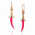 This pair of Gold-18KT earrings are inspired by the (Kirpan) sword. It is designed beautifully and has two different shades of enamel on both sides.  Zircons are set on the top and red stone and a green stone are set on each side to embellish the Kirpan.